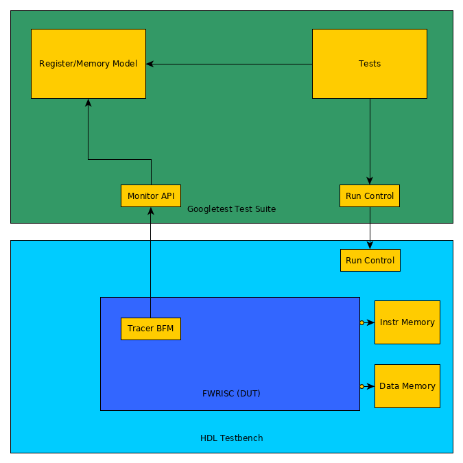 The design is instantiated in the HDL portion of the testbench. This testbench portion will run in Verilator or another Verilog simulator. The Googletest portion of the testbench contains the test suite and code needed to check test results. There are two points at which the environments communicate: the run-control path by which the Googletest environment instructs the HDL environment to run, and the tracer API path by which events are sent from the processor to the testbench environment.