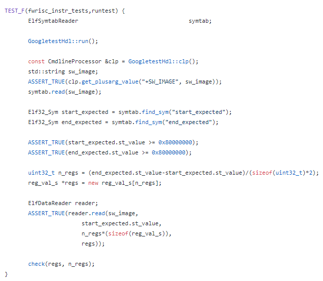 In addition to using Googletest for standard C++ applications, I had used the Googletest framework to manage some early device firmware written in C when testing it against Verilog RTL being verified in a UVM testbench. This approach seemed close enough to what I was looking to do with Featherweight RISC and Verilator that I ended up extending that project (named googletest-hdl) to support Verilator. While the contest required the use of Verilator, I wanted to setup my basic test suite such that it could run with other simulators. Since the googletest-hdl project already supported running with SystemVerilog and UVM, I was covered there.