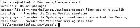 Once you know which software you'd like to install, the edapack install command is used to fetch and install the software into the EDAPack tree. For example, edapack install verilator fetches a pre-built version of Verilator from the release area on GitHub and installs it into the EDAPack tree.