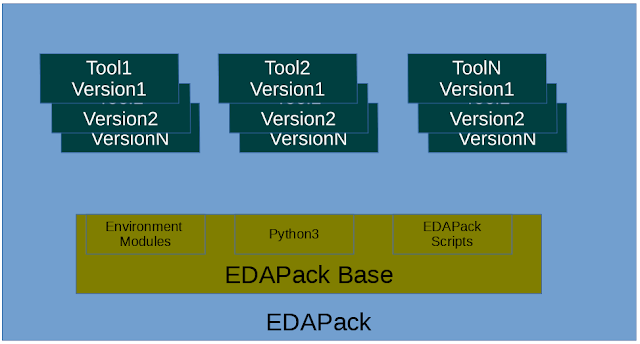 First off is the base set of tools, shown in the bottom box. EDAPack contains an installation of Environment Modules, which is a software package that is somewhat-widely used to manage configuring the environment for different software tools. Modules makes it easy to configure the environment with the right mix of tool versions with a minimum of fuss. EDAPack also contains an installation of Python3, a software package that is increasingly required to run open-source software tools, but is somewhat difficult to get correctly-installed on older Linux distributions. Finally, EDAPack contains scripts to manage installation of tools into the EDAPack tree.