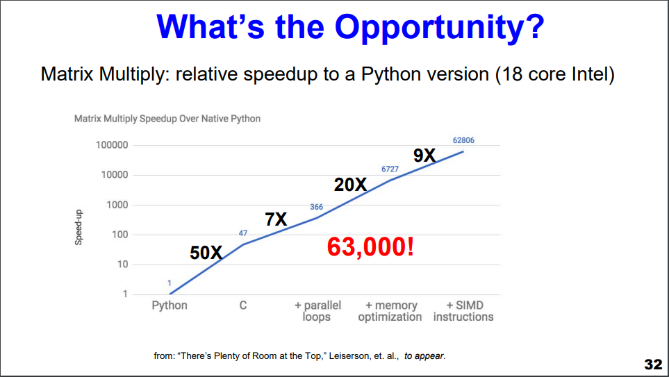 I was fortunate enough to see David Patterson deliver his keynote A New Golden Age for Computer Architecture around a year ago at DAC 2018. The slide above comes from that presentation, and compares the performance of a variety of implementations of the computationally-intensive matrix multiply operation. As you can see from the slide, a C implementation is 50x faster than a Python implementation. Based on this slide and the anecdotal evidence of others, my pre-existing expectations were somewhat low when it came to Python performance. But, of course, having concrete data specific to functional verification is far more useful than a few anecdotes and rumors.