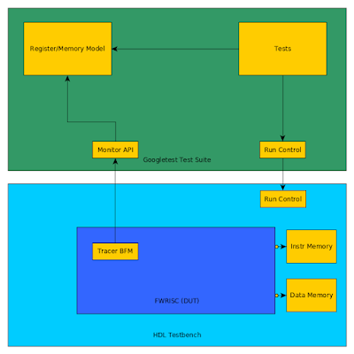 A diagram of the simulation-based testbench is shown above. The Tracer BFM is responsible for monitoring execution of the FWRISC core and sending events up to the high-level testbench as needed. These events include: