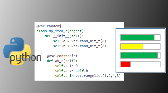 Over the next couple of posts, I'll go through the stimulus-generation and functional coverage features of PyVSC in more detail. Future posts will also tackle what to we can do in terms of static analysis of constraint models, as well as what to do with functional coverage data once we've collected it. Until then, feel free to have a look at the early documentation on readthedocs.io, and have a look at the PyVSC project on GitHub.