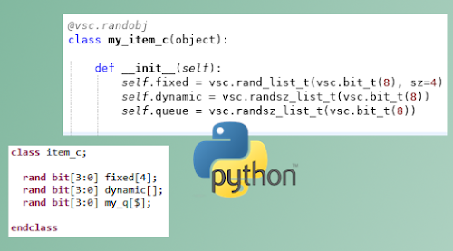 27 Jun 2020Randomizable lists are, of course, very important in modeling more-complex stimulus, and I've been working to support these within PyVSC recently. Thus far, PyVSC has attempted to stay as close as possible to both the feature set and, to the extent possible, the look and feel of SystemVerilog features for modeling constraints and coverage. With randomizable lists, unlike other features, I've decided to diverge from the SystemVerilog. Keep reading to learn a bit more about the capabilities of randomizable lists in PyVSC and the reason from diverging from the SystemVerilog approach.