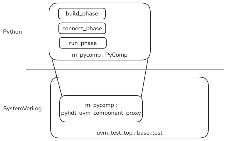 print("Hello from PyComp run_phase", flush=True)The implementation must inherit from the UvmComponentProxy base class. The build_phase, connect_phase, and run_phase methods will be invoked by the SystemVerilog UVM environment.