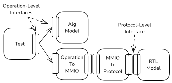 With the right set of abstractors, we can provide multiple views of the same model implementation. For example, an algorithmic implementation of a device with MMIO physical interfaces can be used as a stand-in for the RTL implementation of the device with protocol-level interfaces in a verification testbench simply by adding the right protocol transactors from a library.